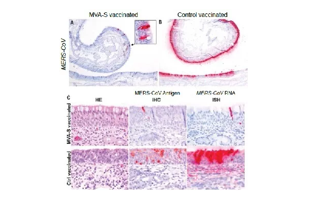中東呼吸綜合征冠狀病毒(MERS-CoV)是又一種近年來高致病性的冠狀病毒。在對該病毒疫苗的研發(fā)過程中,Haaqmans BL 研究團隊通過 RNAscope 技術檢測了注射疫苗的效果,發(fā)現(xiàn)駱駝鼻粘膜內,病毒顆粒在疫苗注射組相較于對照組有顯著下調(見下圖,RNAscope 陽性信號為 A 圖,B 圖和 C 圖中 ISH 中的紅色信號點[3]。