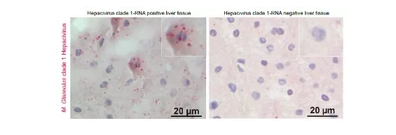 在病毒感染動物模型的建立和驗證中,Drexler JF 團隊通過 RNAscope 的方法,檢測小鼠肝細胞內 HCV 病毒的存在和分布狀況,確認 HCV 病毒感染動物模型建立成功(下圖中的紅色信號點[4]。