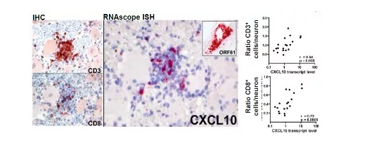 RNAscope 檢測結果顯示感染過 SVV 之后,伴隨著 CD8 陽性 T 細胞的聚集,同一區(qū)域表達 CXCL10 細胞趨化因子,提示 T 細胞的聚集是由 CXCL10 因子誘導引發(fā)的[4]