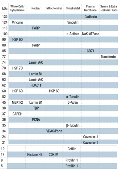 內(nèi)參蛋白主要是一些持家基因,這些持家基因執(zhí)行大量的基本功能,并持續(xù)在多種組織和細(xì)胞中高水平表達(dá)。 常見內(nèi)參蛋白包括Actin、Tubulin、GAPDH、Histone H3等。但是,研究不同類型的蛋白,對內(nèi)參的選擇是有講究的,如1)胞漿蛋白的內(nèi)參與胞核蛋白的內(nèi)參是不一樣的;2)在一定的實(shí)驗(yàn)條件下,內(nèi)參蛋白的表達(dá)發(fā)生明顯的變化時(shí)需要選擇其他表達(dá)不變或者變化很小的蛋白;3)當(dāng)研究的蛋白的分子量與內(nèi)參接近時(shí),需要選擇分子量與目的蛋白的分子量差距比較大的蛋白等。