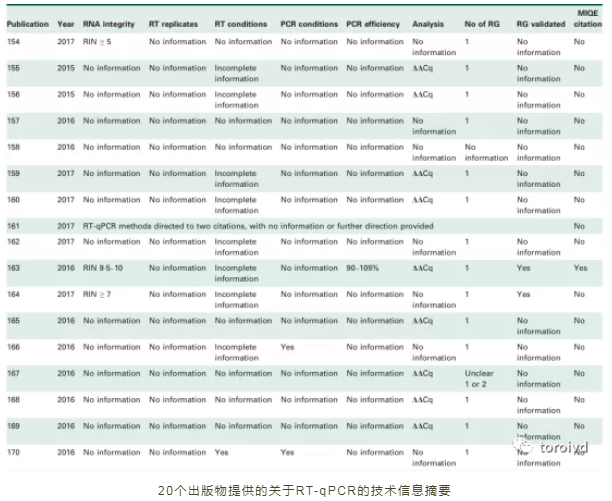 結(jié)果再現(xiàn)性問題2013年,《自然》(Nature)雜志發(fā)表的一篇論文綜述得出結(jié)論,自MIQE指南發(fā)布以來,有關(guān)RT-qPCR方案的必要信息的報(bào)告實(shí)際上有所惡化。雖然指南強(qiáng)烈建議納入必要的技術(shù)信息,但分析的10篇論文中沒有一篇報(bào)道了這一信息。這意味著沒有向讀者提供任何有關(guān)RNA完整性、RNA純度、RT條件或PCR效率的信息,而且所有的出版物都使用了一種不恰當(dāng)?shù)臄?shù)據(jù)分析方法,這種方法在15年前已經(jīng)被質(zhì)疑。作者對(duì)《自然》雜志的20篇近期論文進(jìn)行了重復(fù)分析,得出了基本相同的結(jié)論。更諷刺的是,報(bào)道透明度與期刊的影響因子呈負(fù)相關(guān)。