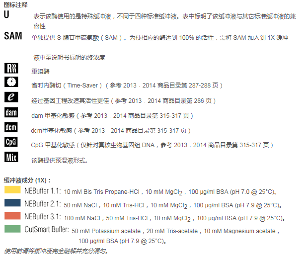 注:表中數(shù)值為近似值,所用底物與內(nèi)切酶定義中的底物相同,更新的內(nèi)容請(qǐng)查閱 www.neb-china.com 及