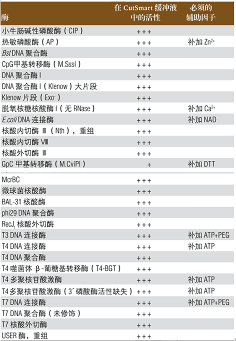 在常用的克隆酶中,選出了一系列 DNA 修飾酶,用 CutSmart 緩沖液代替隨酶提供的緩沖液,進(jìn)行酶活檢測(cè)。比較酶在 CutSmart 緩沖液(添加必須的輔助因子)和隨酶提供的緩沖液中的活性。反應(yīng)體系是根據(jù)修飾酶的推薦反應(yīng)體系建立的,用 CutSmart 反應(yīng)緩沖液替代隨酶提供的反應(yīng)緩沖液。結(jié)果比較如下表中所示。