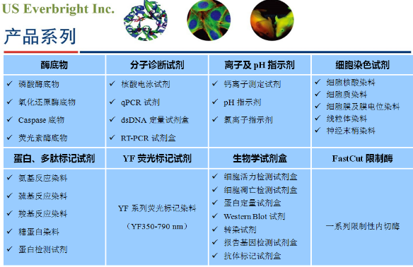 UE公司簡(jiǎn)介:US Everbright? Inc.是一家由原Life technology Inc. 和Biotium Inc.兩家國(guó)際知名生物試劑公司的研發(fā)人員在美國(guó)創(chuàng)立的技術(shù)開發(fā)導(dǎo)向型企業(yè)。US Everbright? Inc.秉持一流世界產(chǎn)品,一流專業(yè)服務(wù)的宗旨,致力于為生命科學(xué)領(lǐng)域科研工作者提供最卓越的產(chǎn)品和最貼心的服務(wù)。