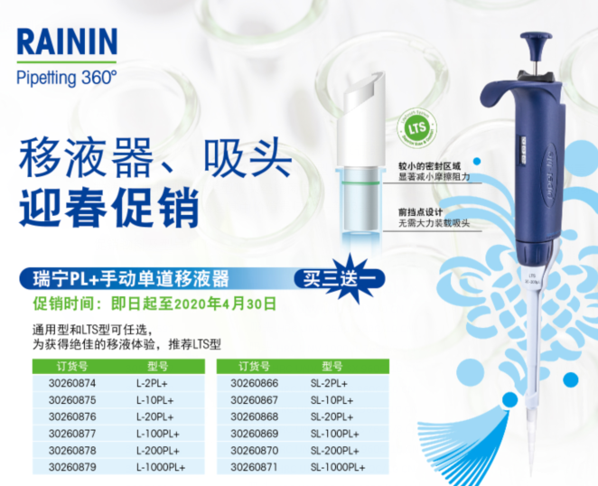 瑞寧PL+手動(dòng)單道移液器買三送一(促銷時(shí)間:即日起至2020年4月30日)