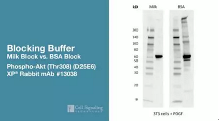上圖是(Phospho-Akt (Thr308) (D25E6) XP??Rabbit mAb)?#13038 用來檢測經(jīng) PDGF 處理的 3T3 細(xì)胞裂解物的結(jié)果圖片。左側(cè)膜是用牛奶封閉,右側(cè)膜用 BSA 封閉。顯然,用 BSA 封閉的膜的背景更高。但用牛奶封閉膜時,磷酸化信號仍然很強(qiáng)且清晰。