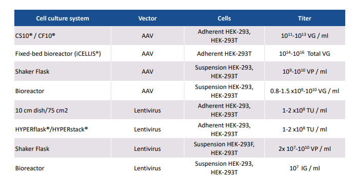 無論基于細胞培養(yǎng)的系統(tǒng)和生產(chǎn)規(guī)模如何,對于慢病毒和AAV, PEIpro?和PEIpro?-HQ的有效病毒載體產(chǎn)量分別優(yōu)于107IG/mL和109vg /mL。