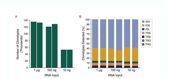使用 NEBNext 免疫測(cè)序試劑盒(小鼠),能夠在同一管中制備小鼠 BCR 和 TCR 文庫。分別使用 10 ng、100 ng 和 1,000 ng 小鼠脾臟總 RNA(Takara Bio #636605)制備小鼠 BCR+TCR 文庫,每個(gè)起始量都做有平行實(shí)驗(yàn)。所有文庫向下抽樣 1,000,000 reads。使用 pRESTO 工具完成 reads 過濾、序列組裝和基于 UMIs 組成共有序列。使用 MiGMAP 鑒別 V、D 和 J 區(qū)域。圖(A)表示每個(gè)小鼠脾臟總 RNA 起始樣本檢測(cè)到的克隆型數(shù)量。圖(B)表示各文庫中 B 細(xì)胞重鏈(IGH)和輕鏈(IGK 和 IGL)以及 Tα 鏈(TRA)、β 鏈(TRB)、δ 鏈(TRD)和 γ 鏈(TRG)所占百分比。