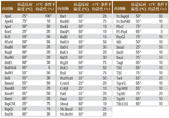 表中列出了限制性內(nèi)切酶的最適反應(yīng)溫度。對(duì)于最適反應(yīng)溫度不是 37℃ 的限制性內(nèi)切酶,請(qǐng)閱 2013﹒2014 商品目錄 284 頁查詢其在 37℃ 時(shí)的活性。