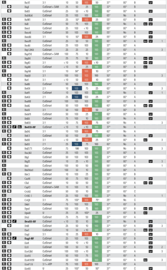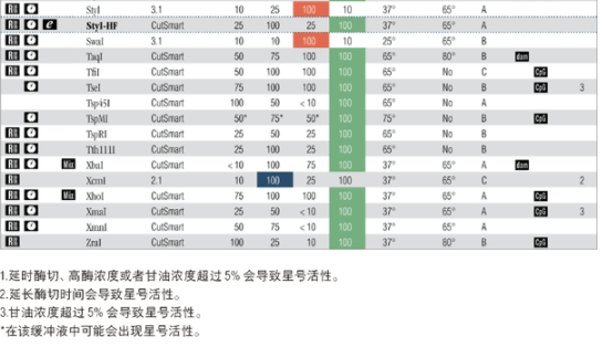 注:表中數(shù)值為近似值,所用底物與內(nèi)切酶定義中的底物相同,更新的內(nèi)容請(qǐng)查閱 www.neb-china.com 及