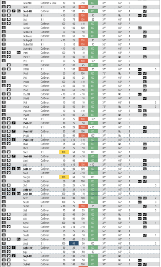 該表總結(jié)了 NEB 所有限制性內(nèi)切酶的活性信息。為了幫助您選擇雙酶切的最佳條件,該表列出了酶的最佳活性 NEBuffer(隨酶提供)和每種內(nèi)切酶在四個(gè)標(biāo)準(zhǔn)緩沖液中的活性。需要注意的是 BSA 現(xiàn)在已經(jīng)添加到緩沖液中,不再單獨(dú)提供。雙酶切反應(yīng)體系請(qǐng)參考 2013﹒2014 商品目錄第 276 頁。此外,活性表中列出了反應(yīng)溫度、熱失活溫度、推薦稀釋液、甲基化敏感性和該酶是否有省時(shí)酶特性(即在建議的反應(yīng)條件下,5-15 分鐘可完全切割底物,過夜酶切也不會(huì)降解 DNA)。
