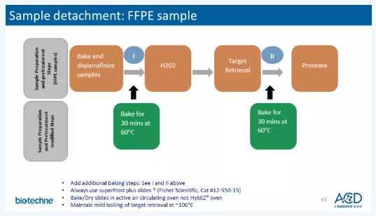 石蠟切片可以在第一步烤片后或者target retrieval之后增加烤片環(huán)節(jié),降低脫片問(wèn)題(見(jiàn)上圖)。